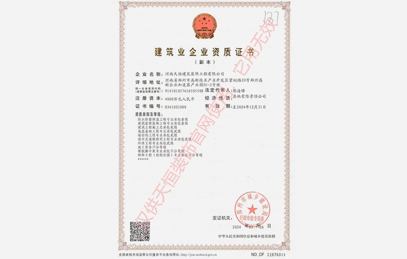 河南天恒建筑裝飾工程有限公司成立于2004年,注冊資金4000萬元,擁有正規(guī)的建筑裝飾工程設(shè)計專項乙級、建筑裝修裝飾工程專業(yè)承包壹級、防水防腐保溫工程專業(yè)承包壹級、地基基礎(chǔ)工程專業(yè)承包貳級、建筑工程施工總承包貳級、鋼結(jié)構(gòu)工程專業(yè)承包貳級、城市及道路照明工程專業(yè)承包貳級、環(huán)保工程專業(yè)承包貳級等多個建筑業(yè)企業(yè)資質(zhì)。